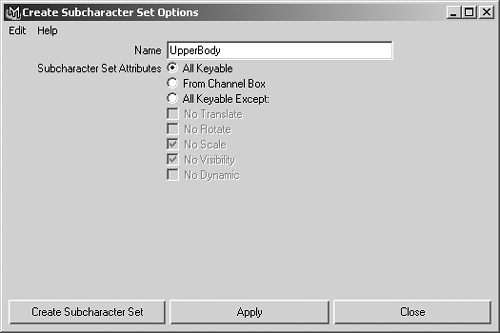 | 2. | First type in the name UpperBody and set Subcharacter Set Attributes to All Keyable. Making sure you have nothing selected in the scene, click on Apply. (You want to leave this character set empty for now because you're going to create the lower body set directly after this.)