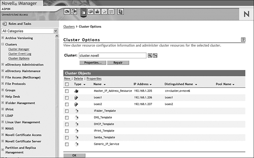 | There are some general configuration options for your NCS environment of which you should be aware. All of these configuration options are available from the Cluster Options page in iManager, shown in Figure 9.3. Figure 9.3. Cluster Options page in iManager.  To access the Cluster Options page in iManager, perform the following steps: 1. | From within iManager, select the Cluster Options link, found under the Clusters category.