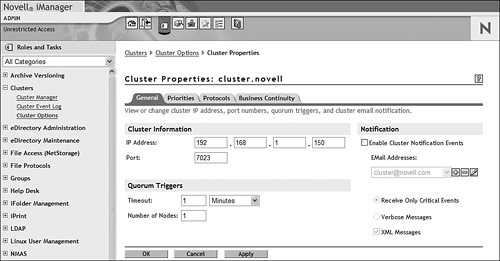 | From this page, configuration parameters used to configure the entire cluster environment can be accessed. To view these options, select the Properties button from the Cluster Options page. This will open the Cluster Properties page, shown in Figure 9.4. The various configuration settings available from this page are described next. Figure 9.4. Cluster Properties page in iManager.  IP Address/Port You can view and change the IP address and port assigned to the Cluster object when you installed NCS. The Cluster IP address normally does not need to be changed, but can be if needed. The default cluster port number is 7023, and is automatically assigned when the cluster is created. The cluster port number should not be changed unless there is a TCP port conflict with another resource using the same port. If there is a conflict, you can change the port number to any other value that doesn't cause a conflict. Quorum Triggers The Quorum Triggers configuration is used to define two trigger values that are used during the startup of the cluster. Timeout Timeout specifies the amount of time to wait for the number of servers defined in the Membership field to be up and running. If the timeout period elapses before the quorum membership reaches its specified number, resources will automatically start loading on the servers that are currently up and running in the cluster. Number of Nodes This represents the number of nodes in the quorum that must be running in the cluster before resources will start to load. When you first bring up servers in your cluster, NCS reads the number specified in the Number of Nodes field and waits until that number of servers is up and running in the cluster before it starts loading resources. Set the number to a value greater than 1 so that all resources don't automatically load on the first server that is brought up in the cluster. Notification NCS can automatically send out email messages for certain cluster events such as cluster and resource state changes or nodes joining or leaving the cluster. Enable Cluster Notification Events Check this box to enable cluster email notifications. If this is not checked, all remaining fields are grayed out. Email Addresses Specify the email address that should receive notifications in the field provided. Repeat this process for each address you want on the notification list. You can provide up to eight email addresses. Receive Only Critical Events Select this radio button if you want administrators to receive notification of only critical events like a node failure or a resource going comatose. Verbose Messages Select this radio button if you want administrators to receive notification of all cluster state changes, including critical events, resource state changes, and nodes joining and leaving the cluster. XML Messages Check this box if you want administrators to receive notifications in XML format. XML messages can be interpreted and formatted in a way that lets you customize the message information for your specific needs. NOTE NCS uses Postfix for sending email alerts. If you are also running cluster resources that use SMTP, the port configured for Postfix must be changed to avoid port conflicts between the two services. You can modify the port used by Postfix by editing the /etc/postfix/main.cf file. For more information on performing this change, refer to http://www.postfix.org. Priorities The Priorities page allows you to control the order in which multiple resources start on a given node when the cluster is brought up, or during a failover or failback. For example, if a node fails and two resources fail over to another node, the resource priority will determine which resource loads first. This is useful for ensuring that the most critical resources load first and are available to users before less critical resources. To adjust the priority of a resource, select the resource in the priority list. After selecting the resource, use the up and down arrow buttons to move the resource to a higher or lower priority. Click Apply when finished. Protocols You can use the Protocol link to view or edit the transmit frequency and tolerance settings for all nodes in the cluster, including the master node. Heartbeat Specifies the amount of time between transmits for all nodes in the cluster except the master. For example, if you set this value to 1, nonmaster nodes in the cluster will send a signal that they are alive to the master node every second. Tolerance Specifies the amount of time the master node gives all other nodes in the cluster to signal that they are alive. For example, setting this value to 4 means that if the master node does not receive an "I'm alive" signal from a node in the cluster within four seconds, that node will be removed from the cluster. Master Watchdog Specifies the amount of time between transmits for the master node in the cluster. For example, if you set this value to 1, the master node in the cluster will transmit an "I'm alive" signal to all the other nodes in the cluster every second. Slave Watchdog Specifies the amount of time the master node has to signal that it is alive. For example, setting this value to 5 means that if the nonmaster nodes in the cluster do not receive an "I'm alive" signal from the master within five seconds, the master node will be removed from the cluster and one of the other nodes will become the master node. Maximum Retransmits This option is not currently used with Novell Cluster Services but will be used for future versions. The master node is generally the first node brought online in the cluster, but if that node fails, any of the other nodes in the cluster can become the master. Cluster Node Properties In addition to editing the configuration of the entire cluster, it is also possible to adjust the IP address of an individual cluster node. This can also be accomplished using the Cluster Options page in iManager. To adjust this setting for an individual node, complete the