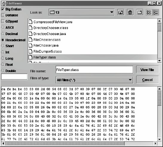 When the user presses the View File button, the mode panel is read to determine exactly how the file is to be interpreted. These parameters and the selected file are fed to the static FileDumper5.dumpFile( ) method from Chapter 12.