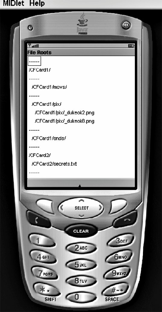In J2ME, the FileConnection class takes the place of java.io.File in J2SE. Thus, as well as methods to open streams, it has methods to get information about the file. Do be careful here. Every warning in Chapter 17 about cross-platform file access goes triple for J2ME. Some small device filesystems look like Windows, but many more look like DOS, right down to a maximum 8.3 filename. Others look like Unix (in fact, some are Unix), and still others look nothing like any common desktop operating system.