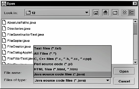Example 18-4 is a program that uses JFileChooser to ask the user to select a file and then prints the file's contents on System.out. This example is essentially the same as Example 18-1, except that it uses JFileChooser instead of FileDialog.