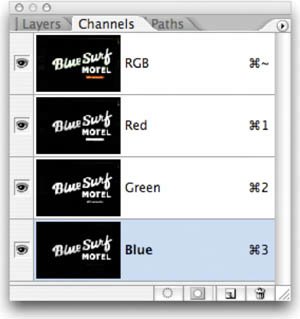 | | | 2. | Bring up the Channels palette (Windows > Channels) and look for the highest contrasting channels. Because you want to remove the background, look for the contrast between foreground and background. The blue channel should stand out the most.