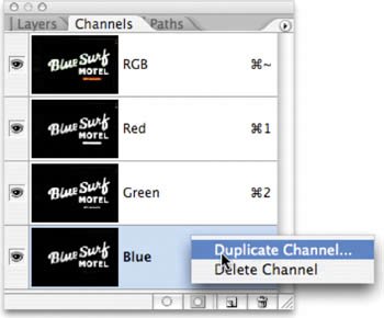 | | | 4. | Right-click (Ctrl-click with a single-button mouse) on the blue channel and choose Duplicate Channel. Name it Selection and click OK to create a new (alpha) channel.
