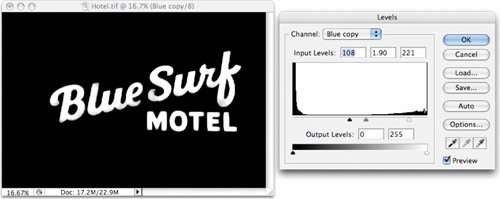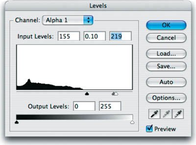 | 10. | Run a Levels adjustment on the channel to adjust the contrast between black and white. Choose Image > Adjust > Levels or press Cmd+L (Ctrl+L). Move the Black Input slider to the right to darken the gray areas to black. Move the White Input slider to the left to brighten the whites in the image. Move the Gray (gamma) slider to the right to close up gray areas.