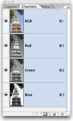 | The next two selection techniques are advanced (in that they utilize channels). Remember, channels represent the components of color. The brighter the area in the individual channel, the more coverage there is for that color. By harnessing the black and white details of one (or more) channel you can create a mask. These two techniques won't be appropriate to use every time (they are image dependent), but they are pretty easy to try out and should be part of your skill set. Using a Channel In many images, there is often high contrast between the different elements. For example, a person framed by a bright blue sky may clearly stand out, since there are a lot of red values in skin and a lot of blue in the sky. You can make a quick decision whether the channel selection technique will work by looking at the Channels palette. Look for a single channel that is high contrast. It doesn't need to be perfect; you can use the Paintbrush to touch it up. Let's use the channel selection techniques to select and modify a logo on the side of a building: 1. | Open the image Hotel.tif from the Chapter 5 folder.