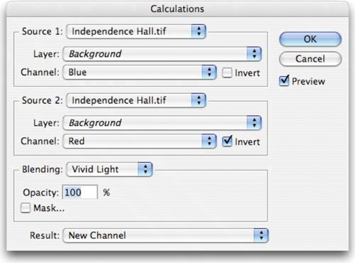 | 6. | Combine the red and blue channels by using Blending. From the drop-down list, try different Blending modes. Blending modes control how two different images or channels blend together placed on their color and luminance values (for more on blending modes see Chapter 9, "Using Blending Modes." Different source images will need different modes. Experiment by clicking through each mode on the list. You may also want to try unchecking the Invert box when working with other images. In the Independence Hall image, the blue and red (inverted) channels combine most effectively using the Vivid Light Blending mode. This will create a new channel that has clean separation between the building and sky.