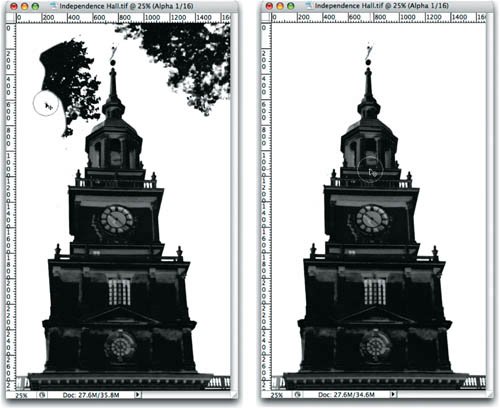 | | | 12. | Zoom in to 100% magnification to look for gaps in the alpha channel. You should see a few in the tower. With your Paintbrush set to black, paint out the spotting.