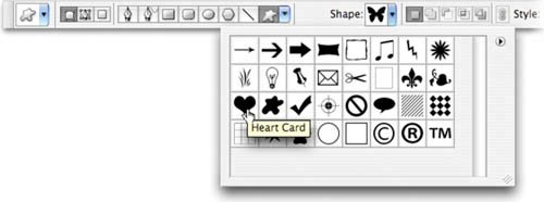 | 5. | Choose the Custom Shape tool. Open the Custom Shape Picker and select the Heart shape. If it is not visible, choose Reset Shapes to load the default set.