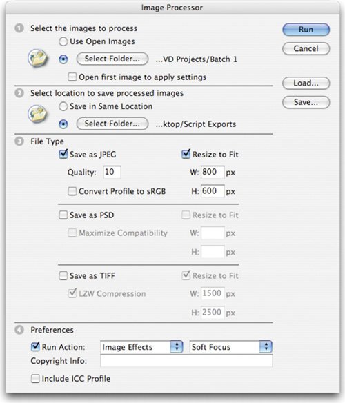 Tip: Saving Settings You can click Save to save the current settings in the Image Processor dialog box. These settings can be reloaded for a later job if needed. For our example, choose an Image action to run on the processed images.