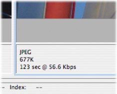 - Image Optimization Info: The area below each image in the Save For Web dialog box gives you optimization information. You can see the current optimization applied, the projected file size, and the estimated download time based on a selected modem connection speed. Choose the JPEG High preset and you'll notice that the file has been reduced from 17.3M to 677K (a significant savings). However, the download time is 123 seconds on a 56K modem (you can right-click the time to choose another speed).