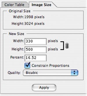 | 4. | We need to further reduce the file size for Internet delivery. The first area to tackle is the actual image size in pixels. Click the Image Size tab and you'll see that the image is almost 2,000 pixels wide (which is much wider than a typical Web page). Type in a Height of 500 pixels, so the image can integrate easily into our Web page (even with a screen resolution of 800 x 600, a height of 500 would allow the image to display without scrolling up and down). Click Apply to resize the image.