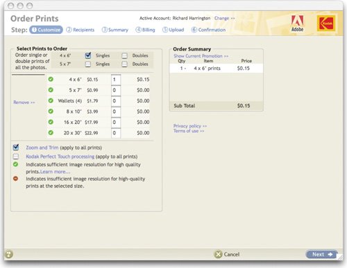 | Photoshop is extremely useful when creating elements for or even producing entire portfolios. With its ability to open both raster and vector files, Photoshop can quickly process your images for print-, Web-, or video-based portfolios. You will likely need a few delivery methods for your portfolio, so keep reading to explore techniques and technologies that will help you show off your work. Printed Portfolios A printed portfolio is the most common form of portfolio for artists and photographers. Finding a physical portfolio to hold your work can be done using a simple Internet search. Be sure to balance size and cost. You want your portfolio to be portable but also show your work off at a reasonable size. Portfolios range in cost from $15$500 plus; it just depends on the size, style, and craftsmanship. Flat books To fill a portfolio, you'll need good prints. The following options are useful for outputting your work: Picture Package: The Picture Package command (File > Automate > Picture Package) is extremely useful for fitting multiple items onto a single sheet. It includes presets for page sizes up to 11 x 17 inches, and you can create your own layouts. This will maximize your color prints by fitting the most images on a page and standardizing their size. For more information, revisit Chapter 15, "Actions and Automation."  Print Online: The Print Online command allows you to send your images to a digital "service bureau." Just choose File > Print Online and go through the guided steps to set up an account. Smaller images (4 x 6 inches) are very affordable, but larger images can get pricey. However, these are high-quality prints on photo paper. In-Store Photo Prints: Several stores, including drugstores like CVS and Walgreens and retail stores like Wal-Mart and Target, offer prints from digital files. Their pricing structure is very competitive, and many offer the ability to upload your files online, then have the prints sent to you or picked up in store. Be sure to crop your images to size, or use the Fit Image command (File > Automate > Fit Image) to match the size of your print. Coffee table books Using Adobe Bridge, which comes with Photoshop CS2, you can create your own coffee table books. The process is easy and fairly affordable. 1. | Place 20 or more JPEGs into a single folder.