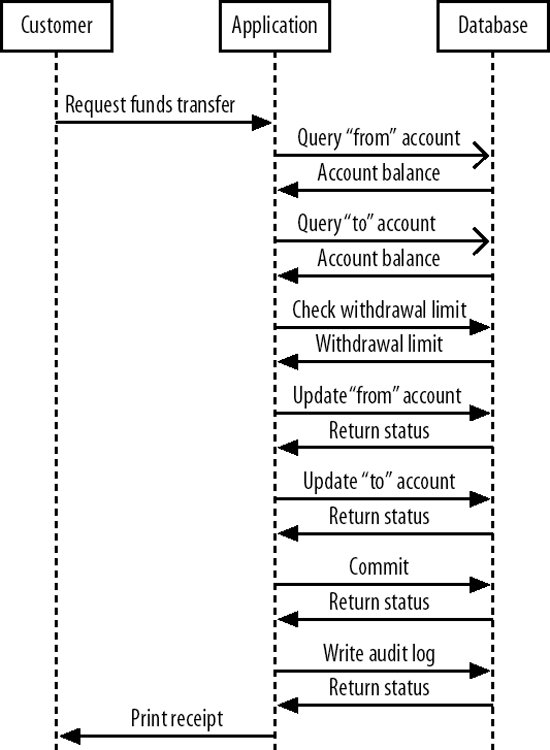 Consider a typical interaction between a bank customer and an ATM machine. The user requests a transfer of funds between two accounts. The application must retrieve the balance of each account from the database, check withdrawal limits and possibly other policy information, issue the relevant UPDATE statements, and finally issue a COMMITall before advising the customer that the transaction has succeeded. Even for this relatively simple interaction, at least six separate database queries must be issued, each with its own network round trip between the application server and the database. Figure 12-1 shows the sequence of interactions that would be required without a stored program.
