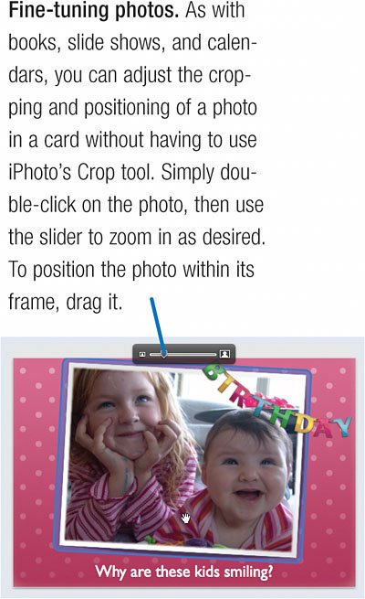 | Card Design Tips Switching postcard styles. To switch between a self-mailing postcard and one that tucks into an envelope, select the back of the postcard, then use the Design popup menu. Switching designs and backgrounds. All card themes provide more than one design option for the front of the card. Many themes, for example, provide an option that lets you type some text on the front of the card. To access different designs, select the front of the card, then use the Design popup menu. Many theme designs also offer a selection of background colors or textures. You can access them by using the Background popup menu.  Fun with fonts. As with books and calendars, you can customize the font formatting of your card in two ways: by using the Settings button, or by bringing up the Fonts panel ( -T). The latter option lets you format text on an individual word (or character, if you want to taunt the design police) basis. And while you're having fun with fonts, note that the textformatting tips outlined on pages 190191 also apply to cards. Print it yourself. As with books, you can print greeting cards and postcards on your own color inkjet printer. Just choose the Print command while the card editor is visible. Note that if you plan to use both sides of the card, you'll need to use inkjet paper designed for double-sided printing. Kill the apple. Ever conscious of brand recognition, Apple prints its logo on the back of a greeting card. If you'd rather not provide the free advertising, click the Settings button and uncheck the box labeled Include Apple logo on back of card. |