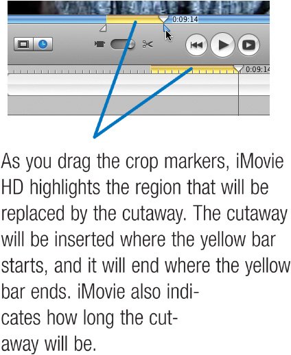 Another way to cutaway. For those times when you want precise control over the contents of the cutaway clip, use a different technique to insert the cutaway. In Step 3, crop the cutaway clip to the exact length you want it to be. Copy the cropped clip to the Clipboard, then position the playhead at the spot where you want to insert itdon't highlight an area with the crop markers. Now choose Paste Over at Playhead. iMovie HD pastes the entire cutaway clip, replacing an equal amount of footage in the timeline.
