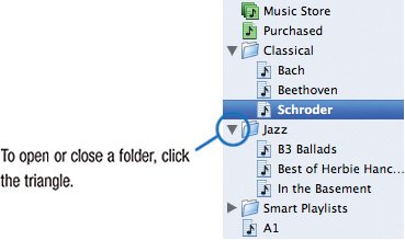 | Viewing and Fine-Tuning a Playlist Organizing Playlists with Folders As your collection of playlists grows, consider organizing them by stashing related playlists in folders. To create a new folder, choose File > New Folder. Then, drag playlists into that folder.  How you use folders is up to you. You might create one for all your jazz playlists and another for your classical playlists. If you have a lot of playlists for various artists, consider stashing each artist's playlists in a folder. If a few members of your household use iTunes, create a folder for each person's playlists. You get the idea. Tip Folders are also a great way to assemble "playlists of playlists." If you select a folder in the Source list, iTunes displays (and will play) all the tracks in each of the playlists contained in the folder. You can also use folders as criteria in smart playlists, described on page 50. |