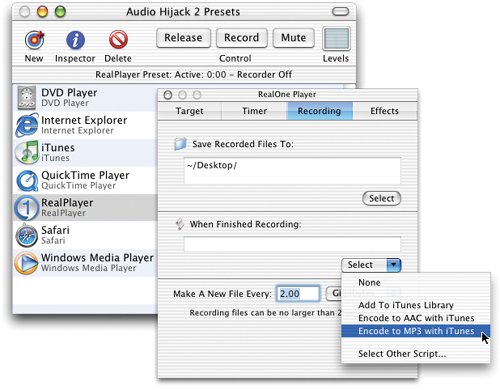 Create a preset for the program whose audio you want to record. If you like, set a timer to start or stop recording at specific times. You can also specify that Audio Hijack run an AppleScript after recording (see page 82 for an introduction to AppleScripts). Audio Hijack includes scripts that use iTunes to encode a recording into AAC or MP3 format.