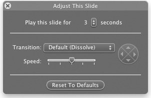 | Tips for Ken Burns By creating your own Ken Burns moves, you can better showcase and crop your photos, and more. Creating a custom move. To create a Ken Burns move, check the Ken Burns Effect box. Then, use the size slider in the lower-right corner to specify the starting and ending zoom positions for the move. When you've zoomed in, you can specify which part of the photo you want to see by dragging within the photo. Zooming without moving. You want to show only part of a photo, but you don't want to crop it because that would change its appearance throughout your library. Solution: Check the Ken Burns Effect box, click the Start position, then zoom in. Now press the Option key and click the End position. Pressing Option tells iPhoto to copy the starting position to the ending position. I call this technique soft croppingit's a great way to improve a photo's composition in a slide show without having to actually crop the photo. Panning without zooming. This Option-key trick also lets you set up moves that pan across an image but don't zoom in or out. Set up the starting position, and drag within the photo to indicate which portion you want to see. Next, Option-click the End position and drag within the photo again. |