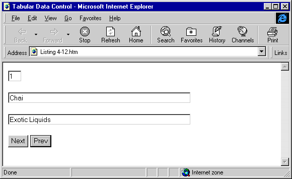 Once the TDC is in a Web page, you can bind an appropriate HTML element to any field in the data source. Listing 4-12 shows a complete example in which the data from a text file is bound to text boxes in the page. The result is pictured in Figure 4-4.