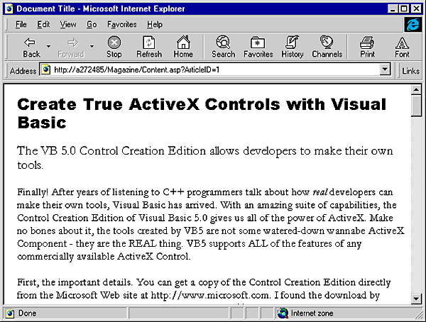 Creating the article page is a simple matter of reading the data out of the database and generating the article content. Add the following code to the BODY section of CONTENT.ASP: