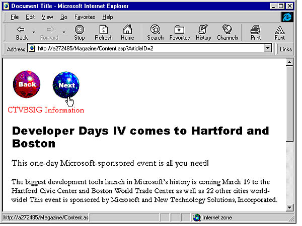 <% ` This code creates navigational tools for the site ` Variables Public objLinker Public intArticleID Public intArticles ` Get Content Linking object info Set objLinker = Server.CreateObject("MSWC.NextLink") ` Get ArticleID intArticleID = CInt(Request.QueryString("ArticleID")) intArticles = CInt(objLinker.GetListCount("Magazine.txt")) %> <!-- Navigational tools --> <DIV> <!-- Next article --> <%If intArticleID > 1 Then%> <A HREF= <%=objLinker.GetNthURL("Magazine.txt", intArticleID - 1)%>> <IMG ID="imgBack" SRC="/Magazine/Images/Back.gif"> </A> <%End If%> <!-- Previous article --> <%If intArticleID < intArticles Then%> <A HREF=<%=objLinker.GetNthURL("Magazine.txt", intArticleID + 1)%>> <IMG ID="imgNext" SRC="/Magazine/Images/Next.gif"> </A> <%End If%> When the user passes the mouse over one of the navigational controls, the page should provide some information about the article that will be displayed if the link is activated. You can show a description of the next link by using Dynamic HTML and the information in the content linking text file. In this step, you will create two <FONT> tags that link descriptions of the articles to the Next and Back icons. Add the following code to the BODY section of the page, just below the section that generates the image controls for navigation: