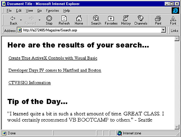In this part, you will add a "tip of the day" feature to SEARCH.ASP, which will show a new Visual Basic tip each time a query is run. This feature uses the TextStream object of the File Access component to access a text file of tips and display one at random.