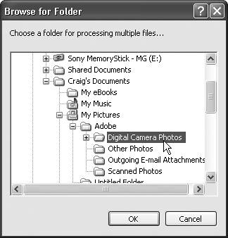 - To select images within a folder on your hard drive, choose Folder, click the Browse button, and then locate and select the folder containing the images you want to convert (Figure 11.15). If there are folders within the folder you select that also contain files you want to convert, click the Include All Subfolders check box in the Process Multiple Files dialog box.