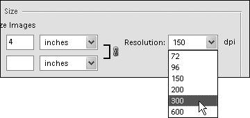 - From the Resolution drop-down menu, choose a resolution in dots per inch (dpi) to change the resolution of all your images (Figure 11.19).