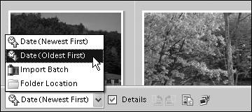 Folder Location displays photos grouped together into the folders in which they're stored, and provides detailed file-path information to make it easy to locate the folder and original files on your hard drive. Figure 13.7. You can select from one of four options to sort thumbnails in the Photo Browser.