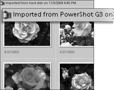 Date (Newest First) displays the photos that you have taken or imported into Photoshop Elements most recently first. Date (Oldest First) displays photos in order from the first one taken to the last. Import Batch displays photos grouped together into the batches they were imported in. Included with each batch is information on when the batch was imported and from what source (Figure 13.8). Figure 13.8. When you select the Import Batch option, thumbnails in the Photo Browser are displayed in grouped, batch sets.