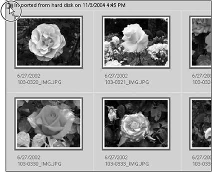Figure 13.40. When you click on an import batch or folder icon, all of the photos in that batch or folder are selected at once.