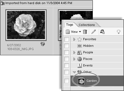 A category icon appears below the photo in the Browser window to indicate that it has been tagged; in the Tags pane, the tag assumes that photo for its tag icon (Figure 13.37).