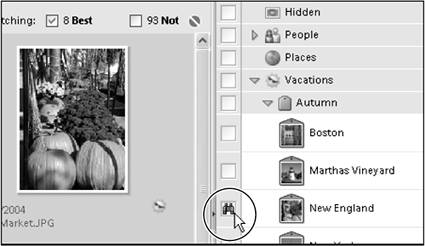 Figure 13.43. When the binoculars icon is visible next to a tag in the Tags pane, only that tag's photos will appear in the Photo Browser.