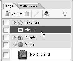 Hidden Tags In addition to the tags that you create, Photoshop Elements provides you a single tag with a very specific function (Figure 13.53). As its name implies, you use the Hidden tag (located near the top of the Tags pane) to make photo thumbnails in the Photo Browser invisible. If you have a set of photos that you're not yet ready to part with, but that you feel are cluttering up the Photo Browser, you can use the Hidden tag to keep them out of sight until you need them. Figure 13.53. You can use the Hidden tag to make photo thumbnails "disappear" from the Photo Browser until you're ready to use them.