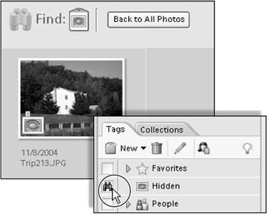 You assign the Hidden tag to a photo just as you would any other tag. In the Photo Browser, either drag it onto a single photo thumbnail, or onto a series of selected thumbnails. A closed eye icon will appear on the face of the photo thumbnail as well as below it, but won't be hidden just yet. In the Tags pane, click the blank box to the left of the Hidden tag. A small binoculars icon will appear in the box and the Photo Browser will change to display just the photo or photos that carry the Hidden tag (Figure 13.54). To return to the main Photo Browser window, click the Back to All Photos button, or click the binoculars icon in the Tags pane. The hidden photo will not appear in the Photo Browser with the other thumbnails until you remove the Hidden tag. Figure 13.54. Photos with the Hidden tag attached are only visible when the binoculars icon is turned on.