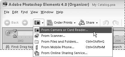 | 3. | From the Organizer shortcuts bar, click the Get Photos button. Then from the drop-down menu, choose From Camera or Card Reader (Figure 2.10).