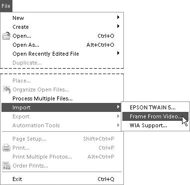 Figure 2.18. Choose the Import > Frame From Video command to convert movie footage into Photoshop Elements image files.