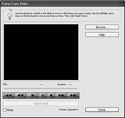 Figure 2.21. After you open a movie file, it appears in the Frame From Video dialog box, where you can play, pause, and grab movie frames.
