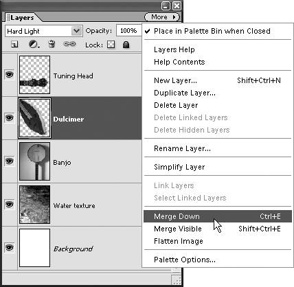| 2. | From the More menu on the Layers palette, choose Merge Down (Figure 5.24), or press Ctrl+E.