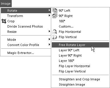 To rotate a layer image 1. | Click a layer in the Layers palette to make it active; then from the Image menu, choose Rotate > Free Rotate Layer (Figure 5.45).