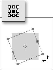 | Tips To rotate your layer image in 90-or 180-degree increments or to flip it horizontally or vertically, choose Image > Rotate; then choose from the list of five menu commands below the Free Rotate Layer command. You can rotate a layer image manually by selecting it with the Move tool and then moving the pointer outside of the selection border until it becomes a rotation cursor (Figure 5.47). Drag around the outside of the selection border to rotate the image. In addition, you can constrain the rotation to 15-degree increments by holding down the Shift key while dragging the rotation cursor. Figure 5.47. Rotate any layer image manually by dragging it around its reference point with the rotation pointer.