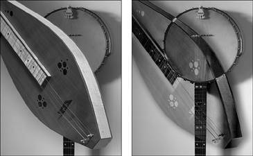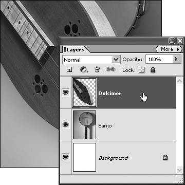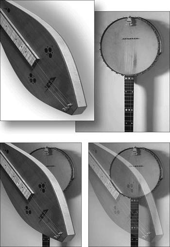 | One of the most effective and simple ways to enhance your layered image is to create the illusion of combining one layer's image with another by blending their pixels. This differs from merging layers because the layers aren't physically merged, but rather appear to mix together. Photoshop Elements provides two easily accessible tools at the top of the Layers palette that can be used alone or in tandem for blending multiple layers together: the Opacity slider and the Blending Modes drop-down menu. The Opacity slider controls the degree of transparency of one layer over another. If a layer's opacity is set at 100 percent, the layer is totally opaque, and any layers beneath it are hidden. If a layer's opacity is set to 30 percent, 70 percent of any underlying layers are allowed to show through (Figure 5.50). Figure 5.50. Two separate layers (top) compose this simple folk instrument collage. The lower-left image displays the top layer with an opacity setting of 100 percent. The lower-right image displays the top layer with an opacity setting of 50 percent.