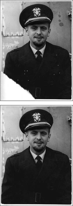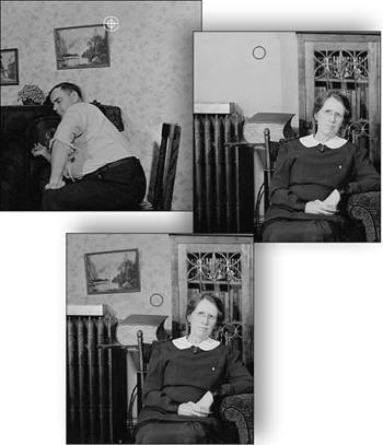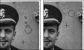 | Little maladies, such as torn edges, water stains, scratches, even specks of dust left on a scanner's glass, are the bane of the photo-retouch artist, and are problems all too common when you set to the task of digitizing and restoring old photographs. To the rescue come three similar but distinctly different repair and retouch tools. The Clone Stamp tool will quickly become one of your favorite tools, not just for cleaning up and restoring photographs, but for any number of special effects and enhancements. It works on the simple principle as copying and duplicating (cloning) image pixels from one part of an image to another. Although it is ideal for repairing tears or holes in photographs, it can also be used to add or duplicate objects in a photograph. For example, you can create a hedgerow from one small bush or add clouds to a cloudless sky. The Spot Healing Brush tool is the perfect tool for removing small imperfections like dust or tiny scratches. With just a single click, the Spot Healing brush samples (copies) pixels from around the area of a trouble spot and creates a small patch that covers up the flaw and blends in smoothly with its surrounding area. The Healing Brush tool operates like a combination of the Clone Stamp and Spot Healing Brush tools. As with the Clone Stamp tool, it first samples pixels from one area of your image to another. Then, like the Spot Healing Brush tool, it blends those pixels seamlessly together with the area you want to repair (Figure 6.18). Figure 6.18. With just a little patience and Photoshop Elements' Clone Stamp and Healing Brush tools, dust specks, water spots, and even torn edges can be easily removed from old photos.