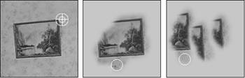 Figure 6.24. Using the image on the left as a source, the image in the middle was cloned with the Aligned option selected. Although the mouse button was released and depressed several times, the image was still copied relative to the initial sampling point. The image on the right was cloned with the Aligned option deselected. Notice that each time the mouse button was released and depressed, the clone again started from the initial reference point.