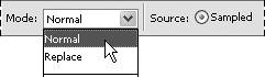 Normal mode will blend sampled pixels with the area you're repairing to create a smooth transition with the area surrounding the repair. Replace mode does little more than duplicate the behavior of the Clone Stamp tool. For information on the other effect modes available from the drop-down menu, see "About Opacity and Blending Modes" in Chapter 5, "Working with Layers."