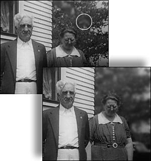 Figure 6.53. The gentleman's face in the original photo (top) is blurred and lacks definition and detail. After dragging the brush pointer through his face and collar, the sharpness and focus in those areas is greatly improved (bottom).