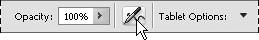 | Tips You can easily resize brushes on the fly using simple keyboard shortcuts. Once a brush of any size is selected, press the ] or [ key to increase or decrease the current brush size to the nearest unit of 10 pixels. Thus, if you're painting with a brush size of 23 pixels and press the ] key, the brush size increases to 30 pixels and then grows in increments of 10 each subsequent time you press ]. Conversely, a brush size of 56 pixels is reduced to 50 pixels when you press the [ key, and the brush continues to shrink by 10 pixels each time thereafter that you press [. When any tool that uses a brush-type pointer is selected (the Eraser, Blur, Sharpen, and Clone tools, for instance), the same keyboard shortcuts as described in the preceding tip apply. Almost any brush can be made to behave like an airbrush by clicking the Airbrush button on the options bar (Figure 8.46). With the Airbrush selection activated, paint flows more slowly from the brush and gradually builds denser tones of color. The Airbrush option is most effective when applied to soft, round brushes or to brushes with scatter and spacing properties. (For more information on scatter and spacing properties, see the sidebar "Understanding the Brush Dynamics Palette" later in this chapter.) Figure 8.46. Click the Airbrush button on the options bar to give a brush the characteristics of an airbrush.