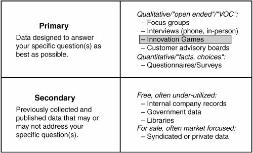 | Primary and Secondary Data Market researchers classify data according to the kinds of questions it answers. The key distinctions are primary data, which are data designed to answer your specific question(s) as well as possible, and secondary data, which are previously collected and published data that may or may not answer your specific question(s). (See Figure 1.7.) Examples of secondary data include census bureau data, which may help you broadly size your market, but may not help you determine how your customers use your product or what they might want in future products. Figure 1.7. Primary and Secondary Data Table  What Kinds of Questions? In addition to the general destinations described in this section, you might have a whole host of specific questions regarding your products and services. Here are various questions that you might have relative to your customers, your markets, and your products and services. We'll start with secondary data, because these are the kinds of questions that are often asked when considering the broad opportunity that you're exploring through your market research. Questions best answered through secondary data: Questions best answered through primary data: What kinds of products could or should we add to our product mix? Which color of yellow is best for our packaging? Which member of the family has the greatest influence in selecting products? Questions best answered through Innovation Games: What features do customers want in the next release? How do customers use our product? How do my customers perceive the relationships between my product and other products? What is my customers' definition of success? |