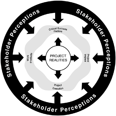 The key concept is that expectations are shaped by both reality and perception. In an ideal project, both the reality and perception of project objectives, performance, targeted results, and expected impact are aligned up-front among all stakeholders during project definition and planning, and then remain this way throughout the project. However, this ideal situation generally eludes us. Even when expectations are aligned during planning, there are many influences and factors that can alter expectations during the course of the project. This relationship is depicted in Figure 18.1. As a project manager, your challenge is to guide the actual "real" performance of the project, while simultaneously aligning and balancing the perception of each stakeholder. This work is a dynamic, ongoing venture that is only complete when the project is closed.